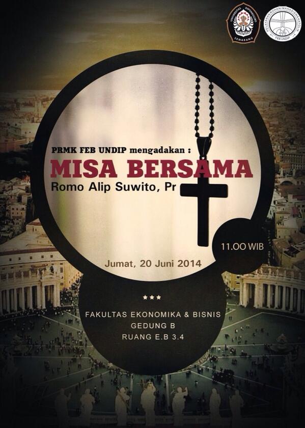 Misa Bersama PRMK FEB UNDIP by admin · June 19, 2014 PRMK FEB UNDIP mengadakan: MISA BERSAMA Romo Alip Suwito, Pr Jumat, 20 Juni 2014 11.00 WIB Fakultas Ekonomika & Bisnis Gedung B Ruang E.B 3.4 Share