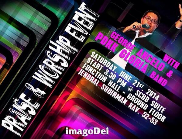 Praise & Worship Event (IMAGODEI) by admin · June 19, 2014 Praise & Worship Event with George Angelo & PDKK Gloria Band Saturday, June 21st. 2014 Start 3.30 PM @ SCBD Suite Function Hall – Ground Floor Jendral Sudirman Kav. 52-53 Imagodei Share
