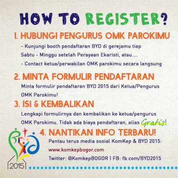 Cukup dengan menghubungi ketua/perwakilan OMK Parokimu dan mengisi formulir pendaftaran, kamu bisa langsung daftar untuk ikut dalam keseruan BYD 2015! Gak perlu pusing soal biaya pendaftaran —karena memang nggak ada biaya pendaftarannya, alias GRATIS!