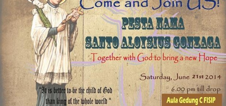 come and join us! pesta nama SANTO ALOYSIUS GONZAGA together with GOD to bring a new hope Saturday, June 21st 2014 6.00 pm till drop aula gedung C FISIP Universitas Airlangga