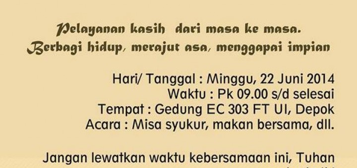 Perayaan Syukur 20 Tahun KUKTEK Pelayanan kasih dari masa ke masa. Berbagi hidup, merajut asa, menggapai impian Hari/Tanggal : Minggu, 22 Juni 2014 Waktu : Pk 09.00 s/d selesai Tempat : Gedung EC 303...
