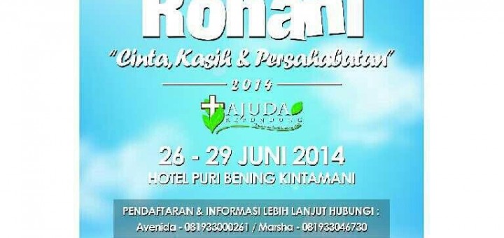 retret rohani AJUDA Kepundung “Cinta, Kasih & Persahabatan” 26 – 29 Juni 2014 Hotel Puri Bening Kintamani pendaftaran & informasi: Avenida 0819 3300 0261 Marsha 0819 3304 6730