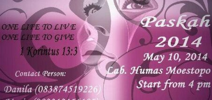 Amicitia, Fratrum, Familiae one life to live one life to give 1 Korintus 13:3 Paskah 2014 May 10, 2014 Lab. Humas Moestopo start from 4 pm cp Danila 0838 7451 9226 Maria 0823 1215...