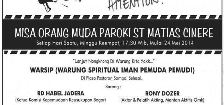 HEI ORANG MUDA … ATTENTION Misa Orang Muda Paroki ST Matias Cinere setiap hari sabtu, minggu ke-empat, 17.30 wib mulai 24 mei 2014 lanjut nongkrong di warung warsip (warung spiritual iman pemuda pemudi di...